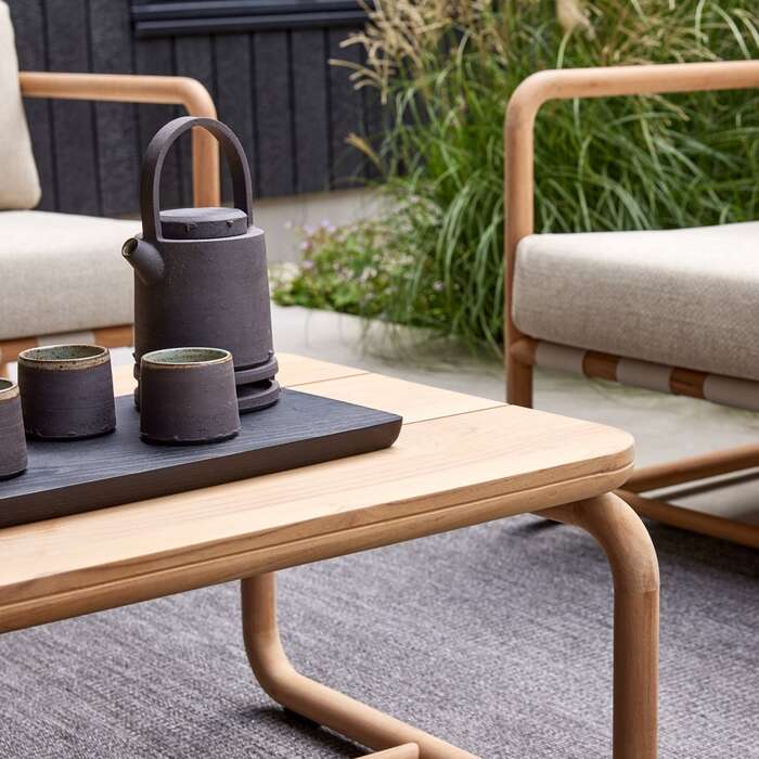 Mooi Teak gecombineerd met Allweather kussens, de Dolce lounge van AppleBee